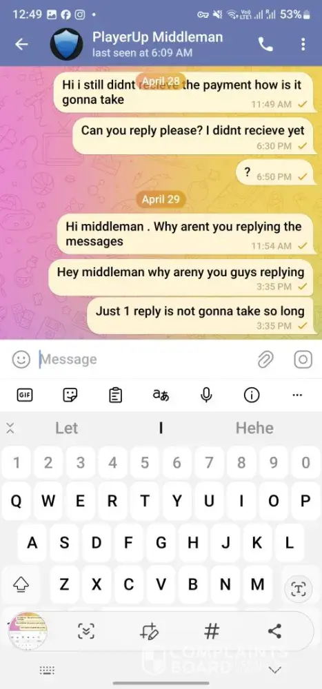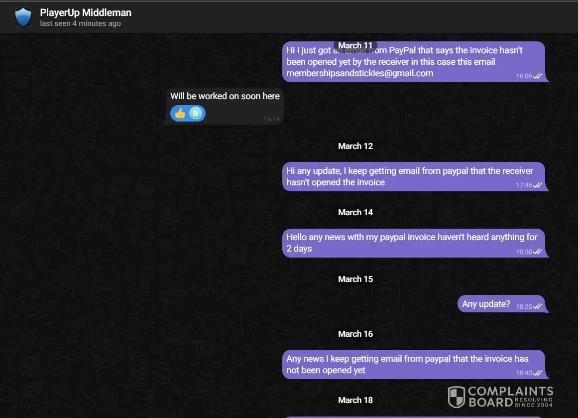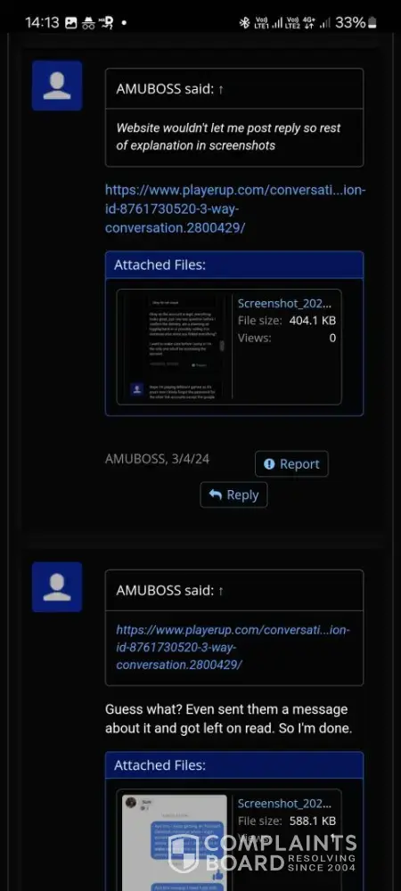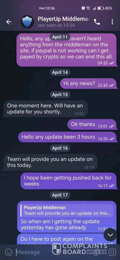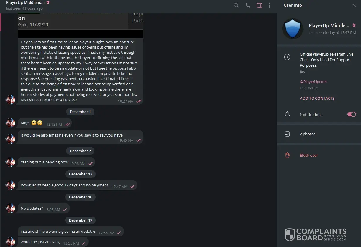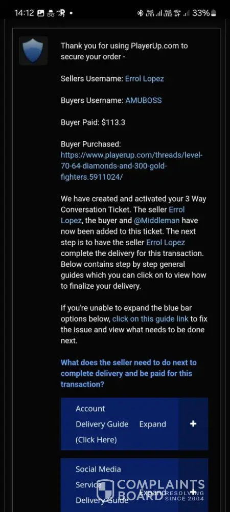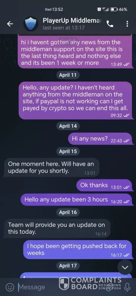 I sold a 7ds grand cross account over 1 year ago and till this day i havent received my money from playerup messaging them everysingle day on telegram always saying youre issue will be resolved but its been 1 year and nothing has been resolved all this for 95usd, sended them the paypal invoices they asked for nothing ofc, oh and forgot to mention they always go radio silence after you message them on telegram.