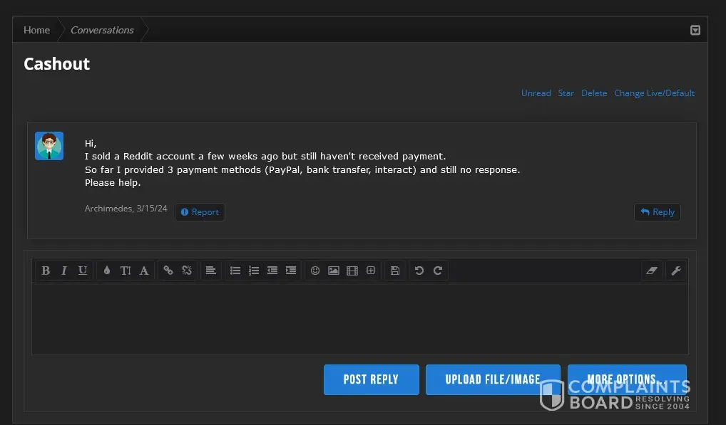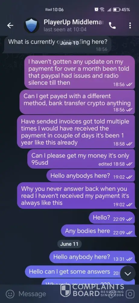 So this is the 2nd time in over 2 months that i have to file a complaint again to get the supports attention for receiving my money after more than 1 year that i have cashed out i have sended paypal invoices to them but no answer only after complaint they answered, after the 1st complaint they reached out and told me they were having issues with PAYPAL and it would have been resolved, its been 2 months since then and i still havent got payed, i even told them i was fine even with bank transfer or crypto payment but no answer as usual so here i am again filing another complaint to get my 100usd.