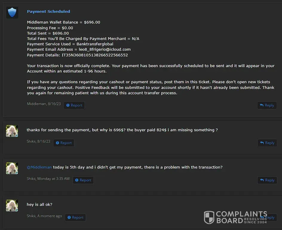 I paid for an order week ago and middleman is not answering. There is absolutely nothing from they side. Not even a one word with reply. I think it's simple scam and nothing else.