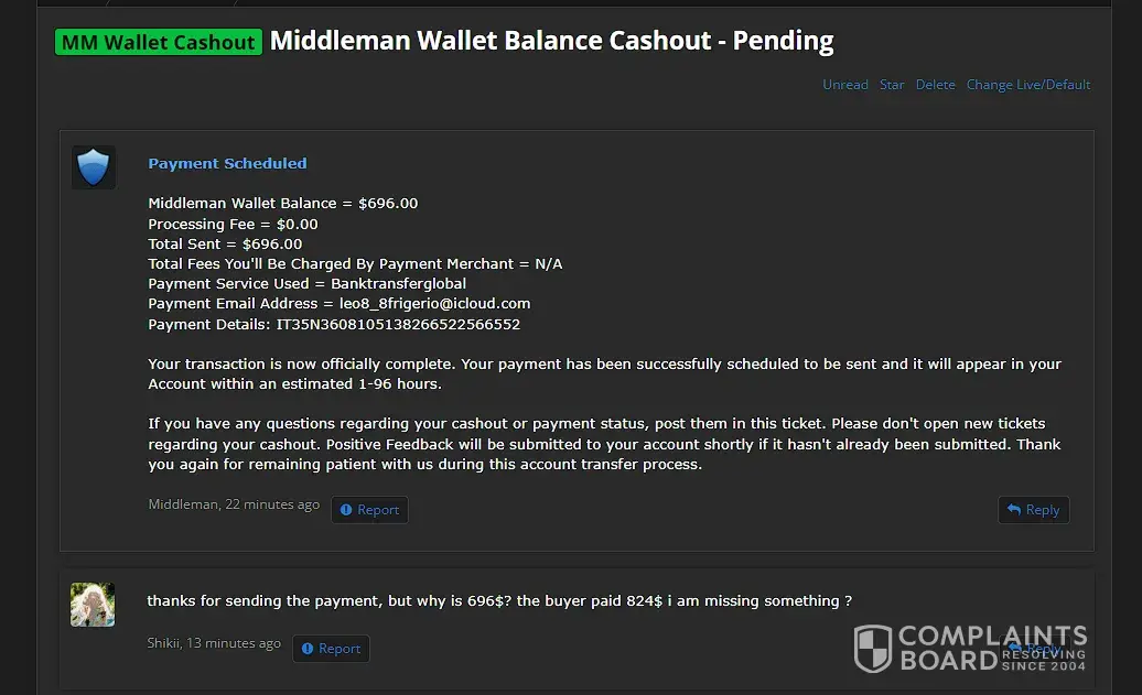 Cashout ticket has been there ever since without any payments. The middleman is out of reach and never replies neither on site nor on discord.