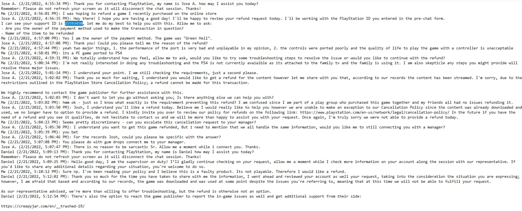 I purchased Green Hell PS4 game from the online store but it is not playable. The frame rate and controls have not been ported well to this platform. After playing for 30 min I requested a refund from the online chat since this is a faulty product but was denied by the agent as well as their manager. See attached transcript.
