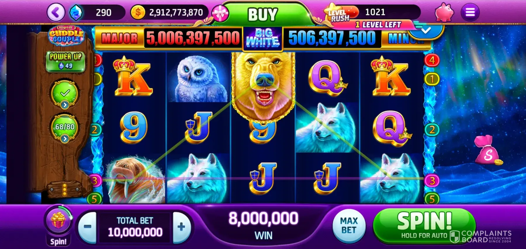 I've been playing the quest on slotomania. I always select easy. The "Big White" slot isn't awarding free spins according to the conditions set forth in the pay table. According to the pay table, free spins are to be awarded when one or more bear symbols are on a winning pay line. This isn't happening and is ruining my play experience. Is there an issue with the game? I'll attach a screenshot. The bear is clearly on a winning pay line and no spins awarded. Very disappointing.