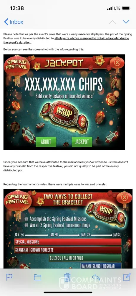 They continue to ignore the situation and even though their chips have no monetary value, they sell chips for real money which I purchased so fraud is still illegal with regard to the money I spent according to their advertising for this tournament and then have been cheated out of chips that should have been evenly split between all bracelet winners