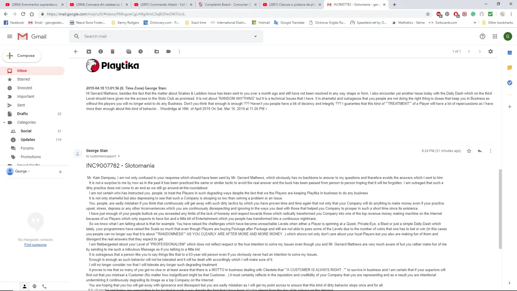 Hi Gerrard Mathews, besides the fact that the matter about Snakes & Ladders Issue has been sent to you over a month ago and still have not been resolved in any way shape or form, I also encounter yet another Issue today with the Daily Dash which on the third Level should have given me the access to the Sloto Club as promised. It is not about "RANDOM ANYTHING" but it is a technical Issues that I have. It is shameful and outrageous that you people are not doing the right thing to doses that keep you in Business as without the players you will no longer exist to do any Business. Don't you think that enough is enough ? Haven't you people have a bit of decency and integrity ? I guarantee that this kind of ""TREATMENT"" of a Player will have a lot of repercussions as I have more than enough about this kind of behavior... Woodridge at 18th. of April 2019 On Sat, Mar 16, 2019 at 11:26 PM <
