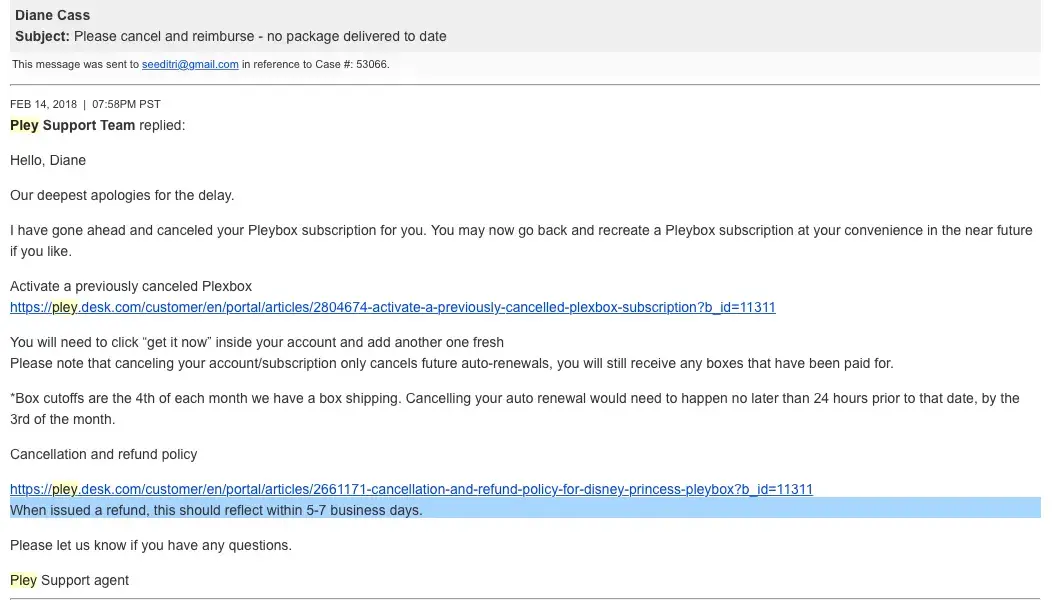 On 5/4/18 I was charged for my disney pley box, on may 21st I finally recieved it... And it only had a tshirt and a yo yo in it... No directions on how to make the box the cinderella castle... Nothing else... Totally not worth the $29.99... I immediately sent an email with a picture to pley because they have no phone number... And waited... Well I finally received a response on may 25th... 4 days later that once they confirmed that they had the missing pieces, it would take 2 weeks for delivery?! Are you kidding me... My kid has waited two months for this box and it was missing almost everything and you are gonna take 2 weeks longer to ship my missing items once it is confirmed... Well here it is june 1st... And I have received no communication whatsoever about confirmation or shipping information... Wth... Do they not realize how impatient children are? Why would it take so long to fix this mistake... The items that were missing should have been shipped the very next day! Anyway... I have sent 2 more emails in the past 7 days since I received their response requesting when I am to receive the missing items... And of course... I have heard nothing... I have cancelled my subscription and for resolution... I just want my money back... I dont want the missing items... I just want to go buy my daughter something because she got this pley box because she made honor roll... Well she made straight a's this report card and deserves the reward... Can someone please help me...