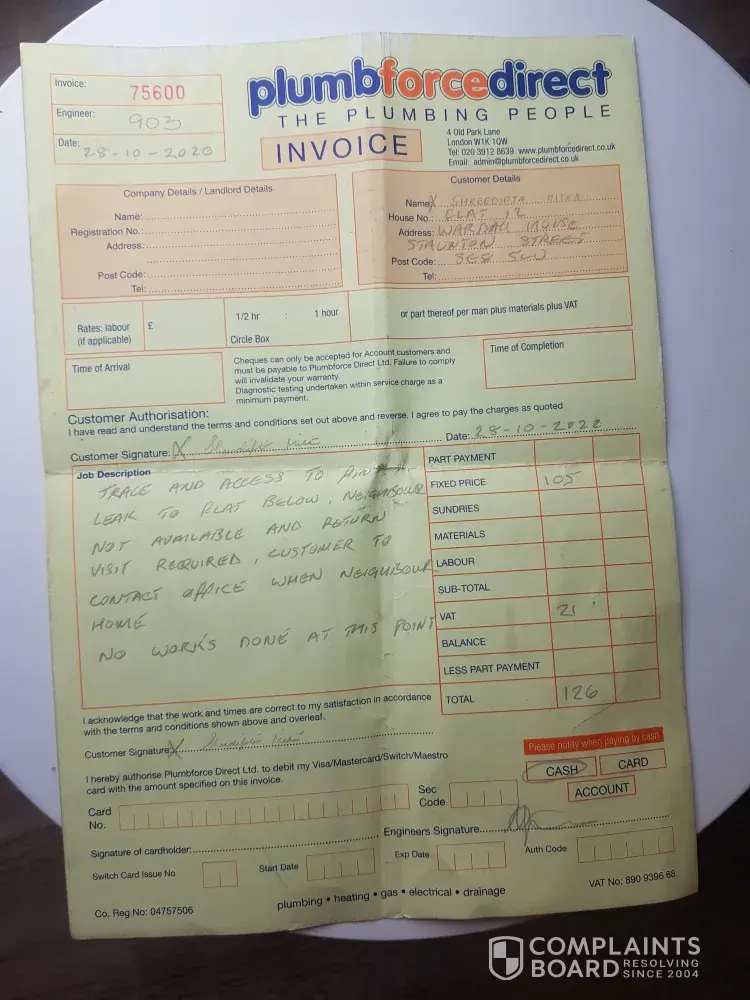 Out of desperation, I contacted another plumbing company, who identified and fixed the problem properly for £460. I provided Plumbforcedirect company with a video and a report from the other plumber, showing that their initial diagnosis was incorrect. When I requested a refund or compensation for their ineffective service, they refused, claiming there was “no proof†despite the documentation I provided.