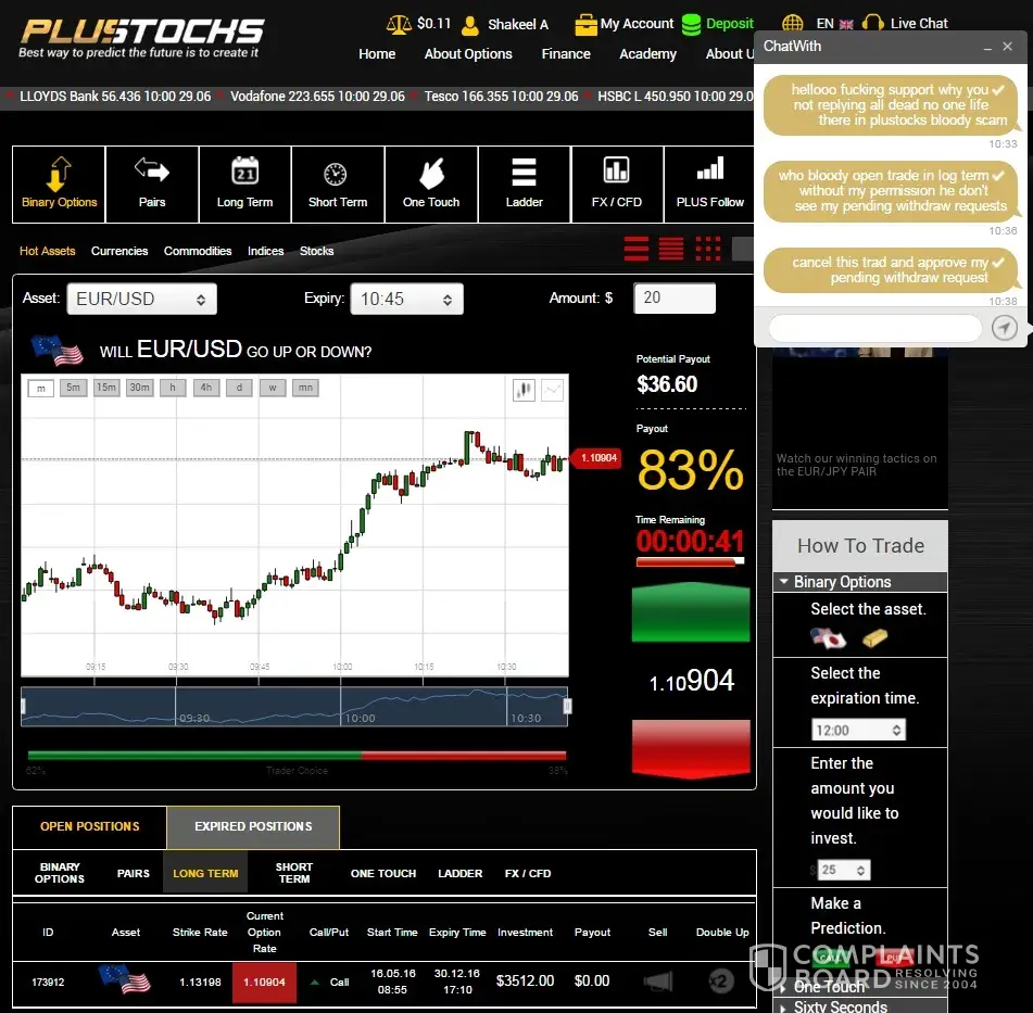 Stay away from PLUSTOCKS they are crooks, i have an issue going o with them which is impossible to resolve. They are not regulated so there is no legal power to press on them. Don't make my mistake. Its Scam i was open an account with plustock and ID no is 119572 and my login email abnieaziz@mail.com.