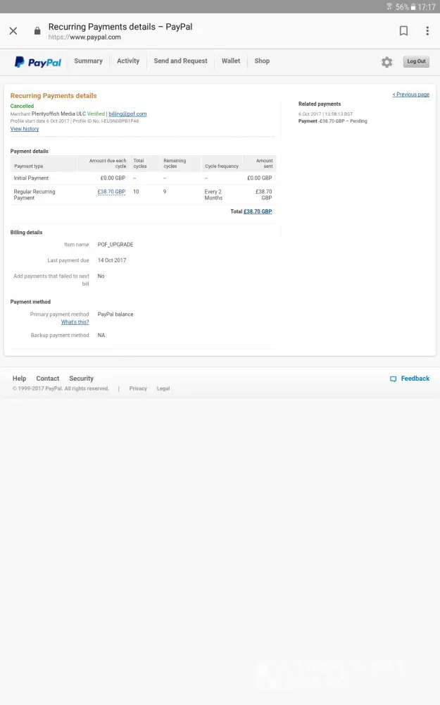 I recently had a direct debit of £38.70 taken from my bank account this was regardless of cancelling my account with pof and this being suspend with paypal all prior to this transaction going through and being processed. I did sign up for one payment at the start of my pof agreement and I did not want or willingly agree to any further payment, this being the reason for cancelling my payments and account.