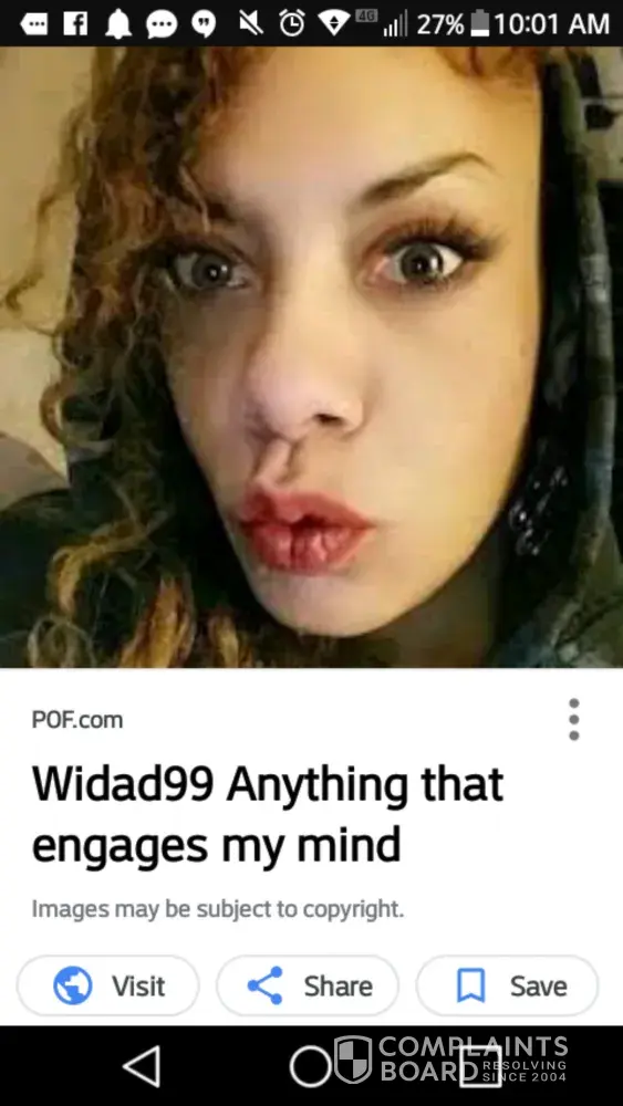 Someone has a POF account using my photos and my first name as there username Widad99 and I do not have a POF account and haven't in over a year and that was not my username and when I try to retrieve the information it won't let me because I don't have an account with them I've tried to contact corporate but no information is given to contact them to ask them to remove my name and photos from whoever email is putting that up its identity theft there stealing my name and photos saying they're me and it's not me