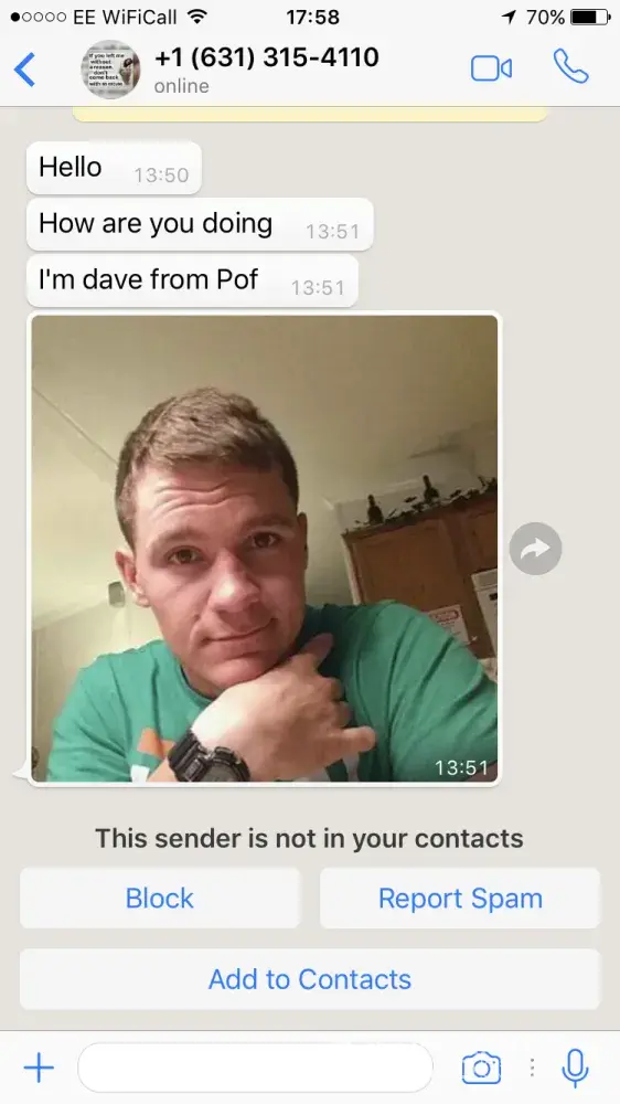 Niceman2947 (Dave) fake profile. Pretends to be an American soldier, in Nigerian (not Nigeria) going to turkey after Nigerian to go to war! 😂😂 then proceeds to ask for an iTunes voucher so he can use WhatsApp. Claims his mum lives in London and he lives in Utah. When I called him out on his lies he got a bit verbal but nothing that even raised an eyebrow. He like to get you off POF onto WhatsApp before he tells you anything about him. Profile picture is of a youngish white male late 30's early 40's (now removed) telephone number he's using is
