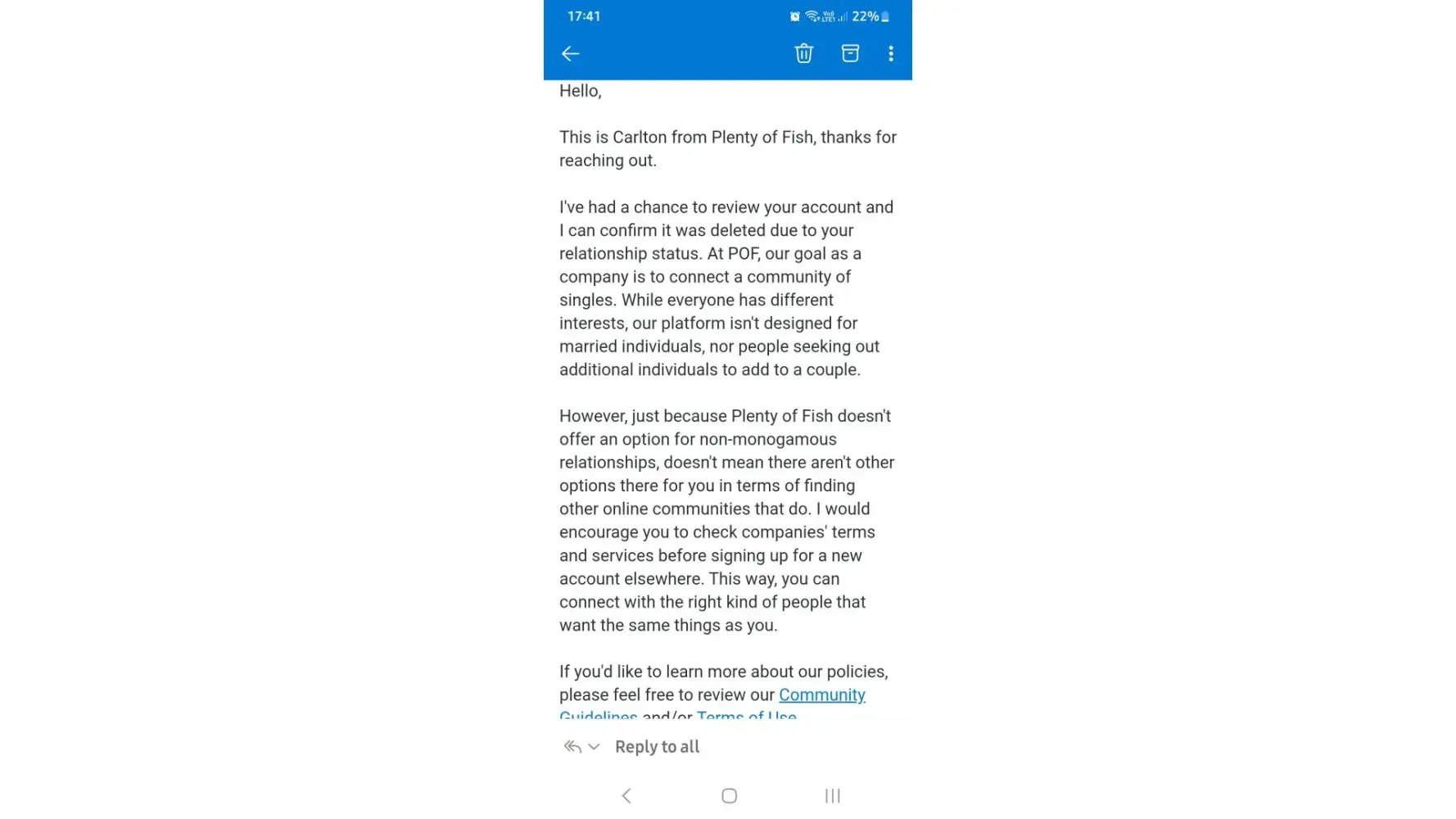 2 days ago I received a notation stating that the account belonging to my e-mail address: [protected]@aol.com was removed due to either a user initiated request OR a violation of your Terms of Use and Community Guidelines. I DID contact your Help Center and was told that this matter would be researched and that I would have an answer within 12 hours . . . I STILL have not heard back from POF as to WHY this has occurred? I would appreciate some information regarding this removal.