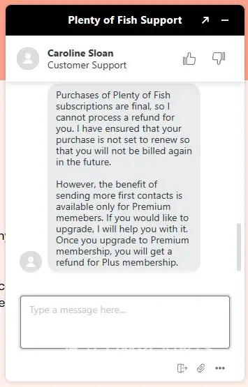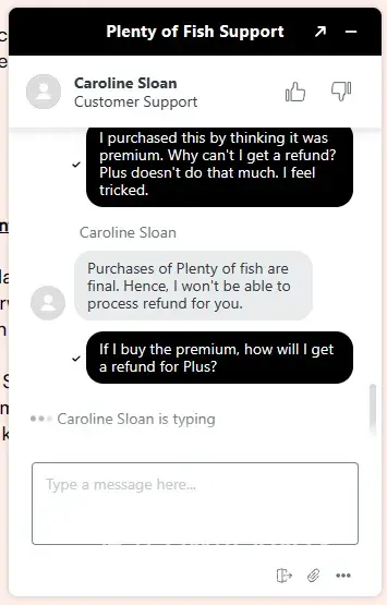 So I was tricked into purchasing a membership and this company won't refund me. I purchased POF Plus by accident, didn't even know this existed and the service does not do what I thought it would. I wanted to message users more than once a day. I thought I was buying premium. Upon contacting Live Chat support, they were incredibly unhelpful and told me that all sales were final and then had the nerve to tell me to upgrade to the premium, which is what I wanted in the first place. I instead got a dumbed-down version of Premium, called POF Plus. I was tricked into buying this service, indefinitely. I want a refund or I'm taking this to small claims court. I'm not going to be robbed by this completely corrupt company.