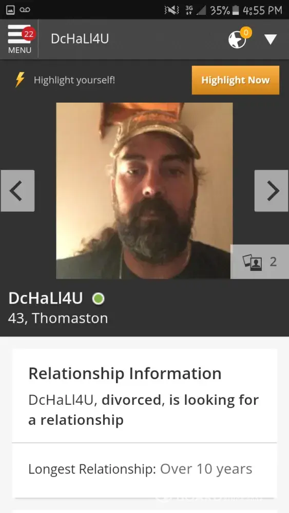 I am reporting that the person & person's account(picture included), is a LIAR. He most certainly IS NOT divorced. He's very much still married. I know this for a fact because I AM HIS WIFE!!! I can verify this. You can email me at [protected]@gmail.com. My name is Ginger Hall. Also, I am reporting that several profiles he is looking at is local teenage...