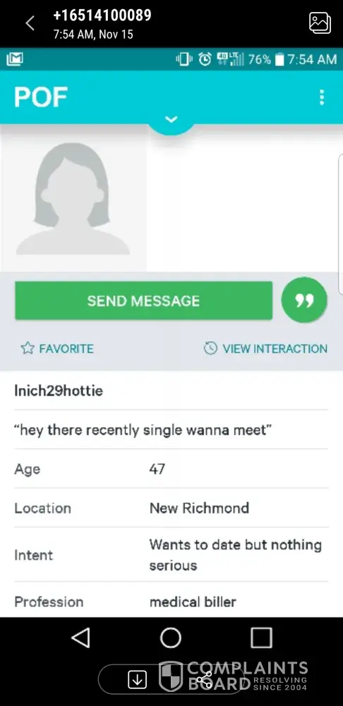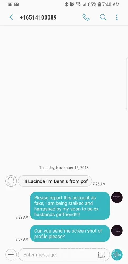 My name is Lacinda Nichols, i do NOT have a profile on POF. I have been getting messages. I believe it is my soon to be ex husband, Ricky which i has a restraining order against or his girlfriend Angela Gorr DOB 8/5/77 ADDRESS 444 meadow lane, Somerset WI 54025 phone # [protected] harassing me. Please i beg you find this profile and close it immediately!
