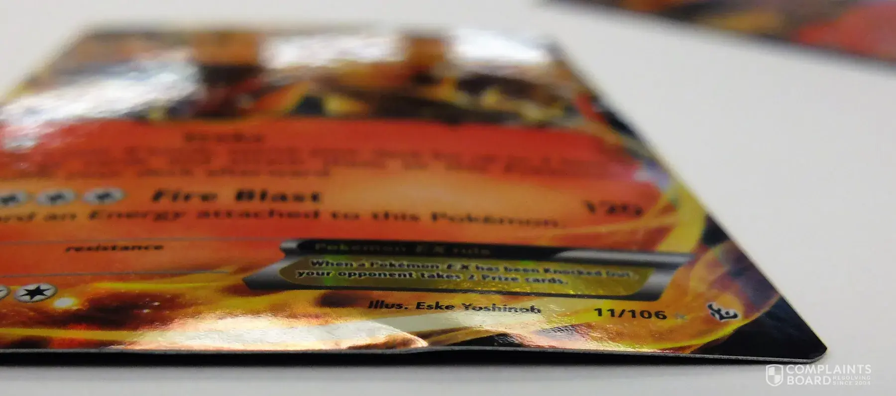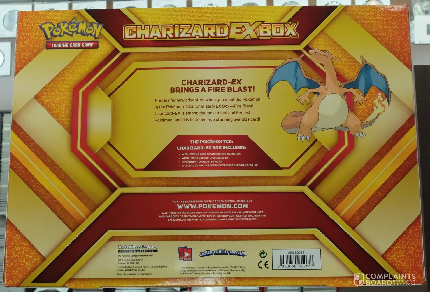 Hi my name is Leigh Bevington owner of South Edmonton Coin & Currency Ltd. at 5712 111 Street NW, Edmonton, Alberta, T6H3G1, Canada. Phone [protected]. We purchase Pokemon cards from our supplier Universal Distribution in Vancouver, Canada and sell in our store. We received a case of 12 sealed Charizard EX boxes on July 4, 2018 from our supplier. After we opened a couple of boxes in my store to sell the Charizard EX cards separetly we noticed that there were factory damaged Pokemon Charizard EX cards in all 12 of the sealed boxes, as per the pictures attached. The sealed cards are bent, almost torn, and have multiple indented scrapes or marks on the back surfaces, but not on the front, again as per the pictures attached. We cannot sell these either individually or as a boxed set as all the Charizard EX special holo card are damaged goods, visible to the eye in the sealed box set itself and even more evident when taken out of the set. We are looking to please have refund, new products sent out to us for resale at our store or whatever else you can think of, please and thank you.