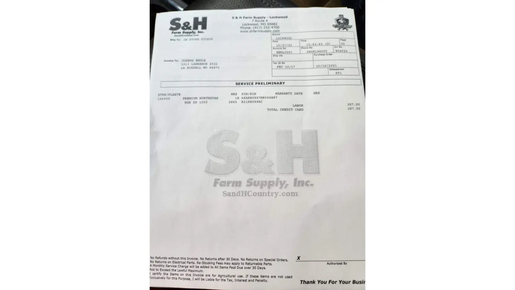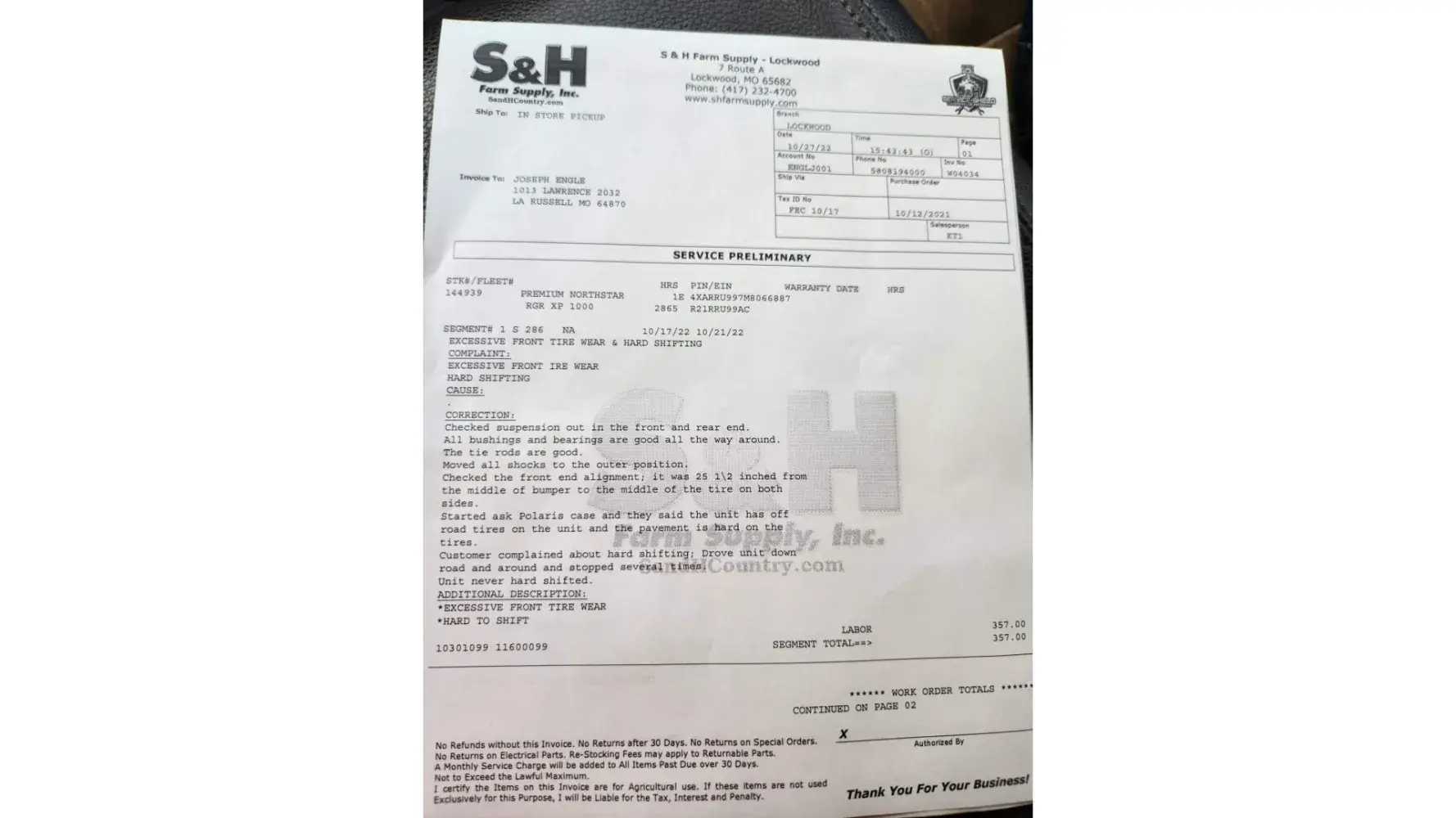S&H Farm Supply of Lockwood Mo. says it took 3 hrs. to check my unit and say there is nothing wrong with it! Although the tires are wearing bad on the inside of the tires (like the toe - ends out of adjustment) they adjusted the front shocks to the highest point and sent it home with a $357 bill. Even though it's still under warranty they say I have to pay the bill because nothing's wrong! It's really frustrating we spend that much money on a machine we use every day on the farm, it's only on paved road once a week, two-mile round trip! This is not a toy or abused, we are sixty years old. See attachments for details.