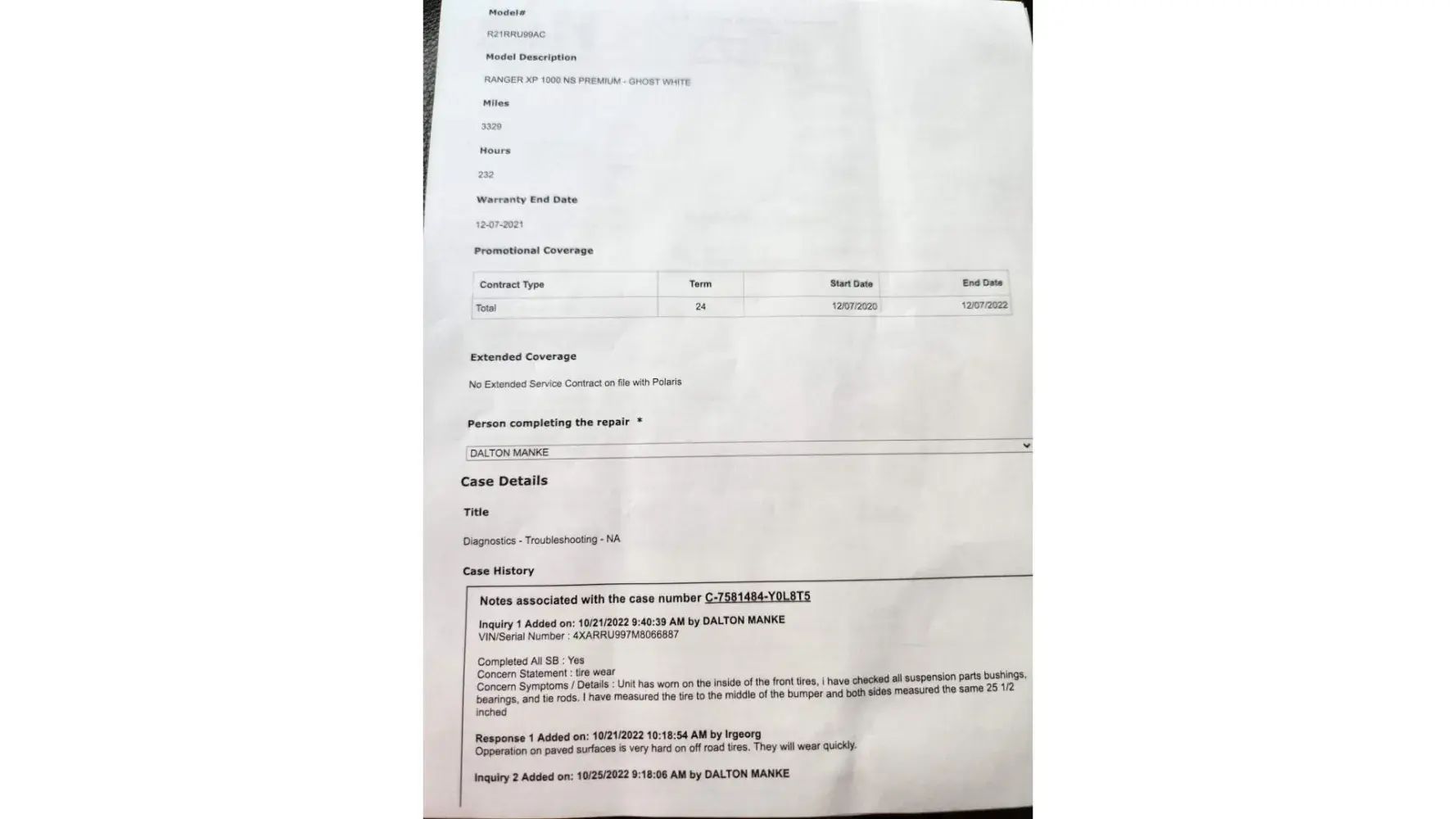 I am rejecting this response because: This is such a cop-out. This vehicle was immediately taken to an authorized Polaris dealer in Frederick, MD. Let me re-iterate. Polaris will not respond to requests for customer service. The only reason that they called me was to say that they "care" about their customers on BBB. The first excuse was - insurance took care of your vehicle so Polaris does not have to. Second excuse was "the vehicle is not designed to tip onto its side". The third and most ridiculous excuse was in their BBB response. How is it MY responsibility to have the authorized Polaris dealer get Polaris involved?