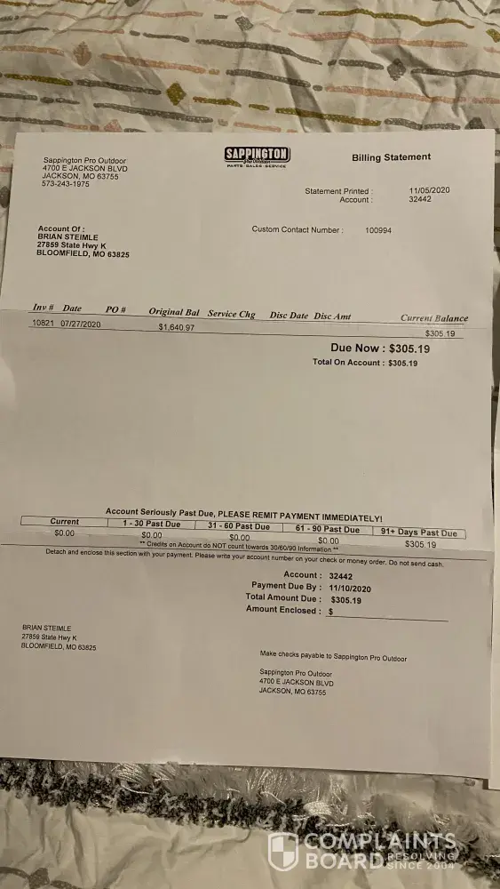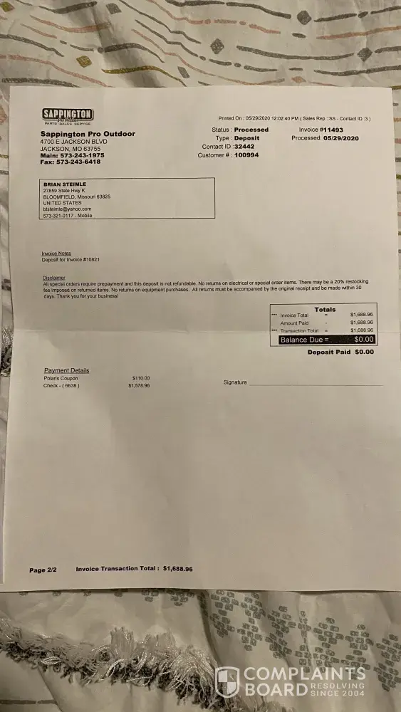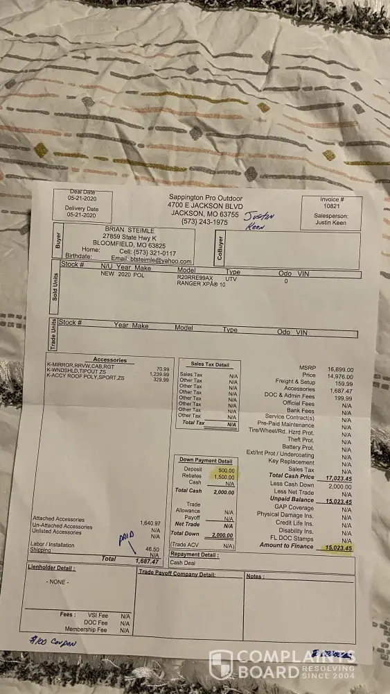 Paid in full for accessories $1688.96 of our new Polaris Ranger in May 2020. 10 days later the owner said he gave us a rebate and was incorrect. So he sent us a bill for what we already paid. With a different invoice number. After we had the accessories installed he tried to keep our new side by side and called us names and harassed us. Now he has sent bills each month. We told him it's paid in full so then he changed the amount from $1688.96 to $305.19. And now says we are 90 days passed due. He also told us he will not guarantee our warranty with Polaris or service our Ranger. He should not be able to sell Polaris due to him being so harassing.