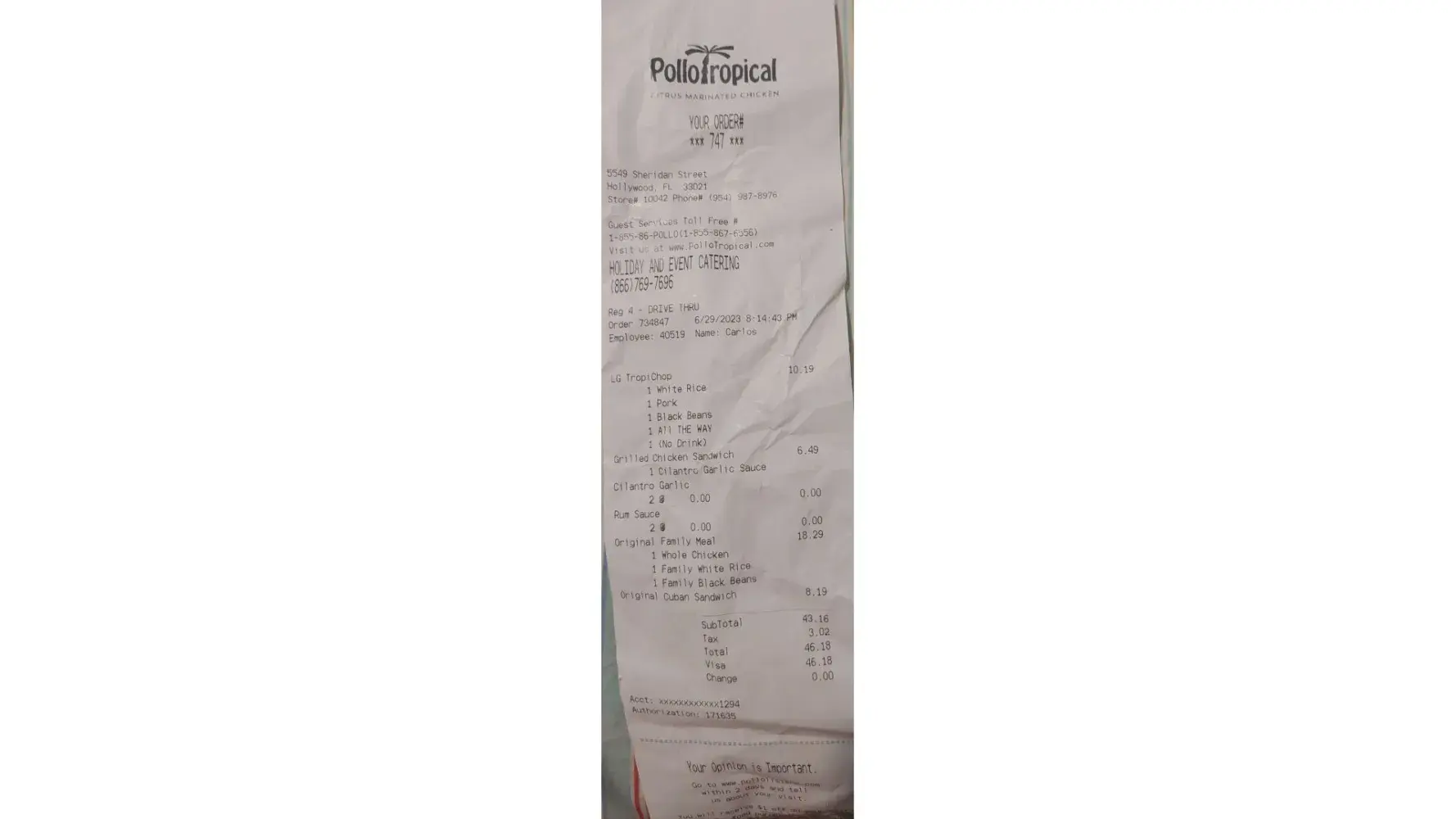 Read full complaintDelivery and pollo tropical ap