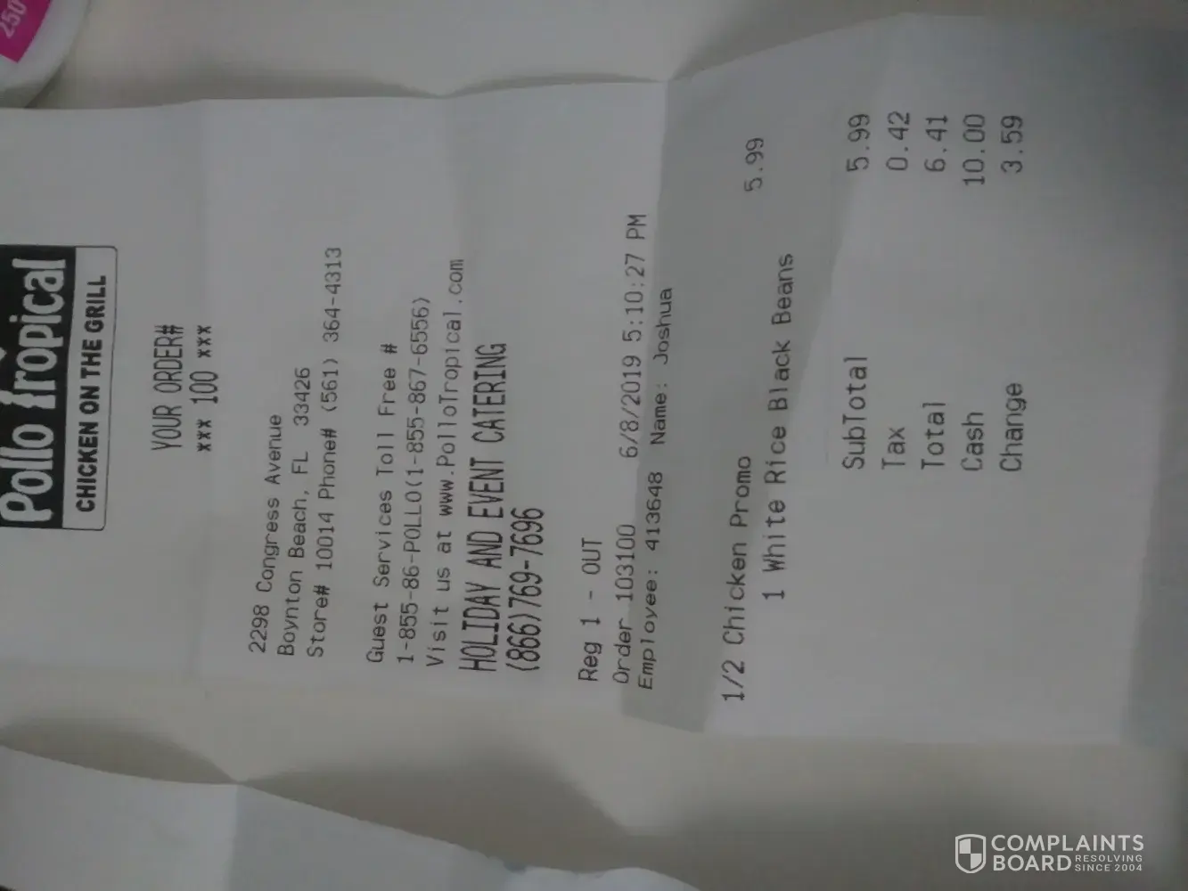 Order a tropichop White rice black beans and boneless chicken and a lemonade on May 5, 2019 at 3:22 PM After 10 minutes of waiting noticed that peoples that came after me getting there orders ask the person at the counter where is the order the Lady at the counter said where is the receipt give her the receipt she says that's not what on the screen she...