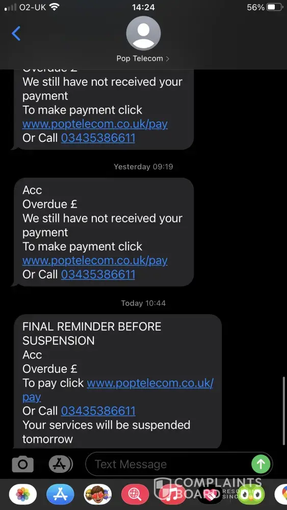 Just a warning to potential customers , please avoid , this company is a snakes pit , i was issued with a final payment not from pop telecom , but a debt company used by pop telecom , no warning , no letter saying i still owed money just a threatening letter from debt company , how many oap out there have been intimidated by these low lifes ...please avoid this company they need to cease trading