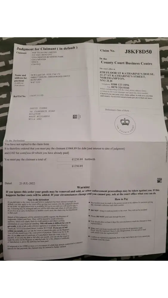 Hi I am messaging you as I have received a judgement for claimant through the post my name is David Corns the balance is for £1068.89 I have never had an account with you so would like to find out why I am receiving this off you or the court when I have not received anything previously from you. My email address to contact me on is bradley.[protected]@hotmail.co.uk