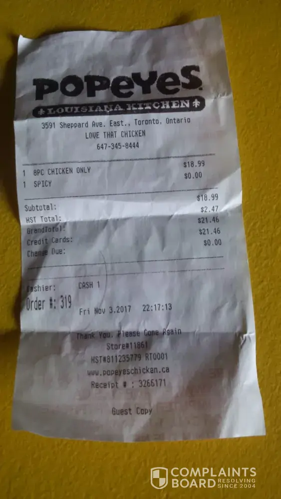 This occured November 16, 2017 at Popeyes located at Yonge and Dundas, Toronto, Ontario, Canada (273 Yonge St, Toronto, ON M5B 1N8). I'd like to complain about an employees disturbing attitude towards me as a customer. Firstly, when i placed my order, I was not given a receipt by this employee. Secondly, once I ordered my food, I waited patiently by the pickup area for around 15-20 minutes but my order was not called out. Then I decided to sit back down at a close distance to the cashier and my order was still not called out. I went back up and waited right in the front and another cashier spotted me waiting for a long time and asked what my order was realizing it wasn't even told to the kitchen. I've had enough and sat back down realizing it would take a while, then about 5 minutes later I went to ask why its taking so long and the employee who took my order (in a blue shirt, not sure if this was the manager ) came up to me with the food and rudely said "I told you to wait at the cashier, I called your order up a long time ago, " then shoved my food at me, gave me an incredibly rude, disgusting look and walked away. However I know for a fact she didn't call my order because I was constantly standing up there, long enough for another employee to even notice it was an abnormal amount of time and had to ask my order again. Not only did they take over 25 minutes for my simple order of a sandwich, the employee (blue shirt) failed to give me a receipt, gave me attitude for patiently waiting for my food and asking merely once if my order was ready AND didn't even apologize for the delay or her rudeness. This occurred sometime between 4.45pm-5.20pm on November 16, 2017 at the Yonge and Dundas location. Please ensure to talk to this employee so future customers don't receive such disgusting attitude and customer service. Thank you.