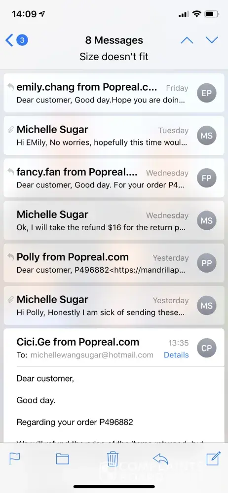 I placed an order that contained 51 items June 2018. Pop real shipped 6 of the 51 items August 2018. In September I began inquiring about remaining missing items. As of January 9 2019 Popreal has not responded. I have tried contacting them through my financial institution and they provided tracking information for the 6 items and refused to issue a explanation or refund for over $300 worth of never shipped merchandise. I now have to pursue legal dynamics to get my money.