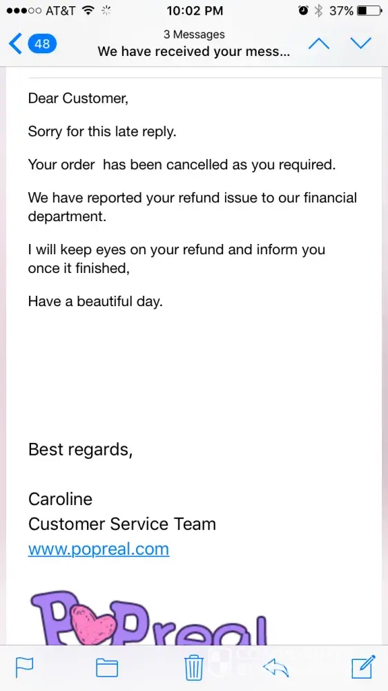 I placed an order some weeks ago. I haven't gotten an email confirmation or a tracking number! i haven't heard from the company since that day i placed my order and they took my damn money. I reached out to them several times asking for a confirmation number of tracking number so i can see what's up with my order. I didn't hear from them so i tried to cancel my order and get my no st back and go shop somewhere else. I still haven't heard from popreal...Haven't gotten my order or my money. My next step is start writing bad reviews and calling the police...The news and better business bureaus! this is ridiculous and inconvenient for me!