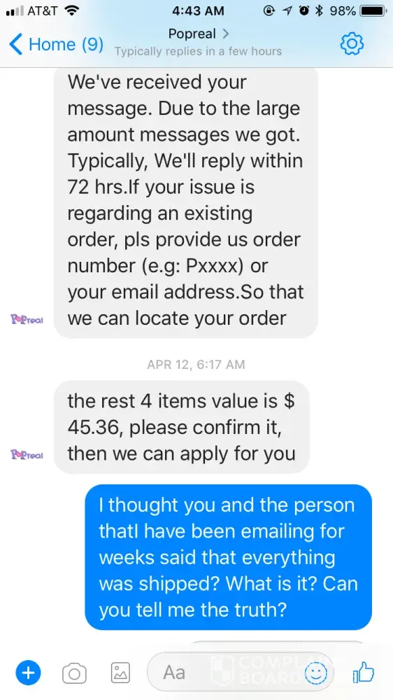 They don't update your order status on the site. (Even now, after receiving items, it shows them as being paid for, but not sent.) I tried calling the number posted on their site-it's only an outgoing message. I emailed multiple times. The two times I did receive a response to my emails 1) I was asked to be patient because two items were on backorder AND that they were slower than usual because of Cineese New Year (mind you the website claims to be in England); 2) then they sent a tracking number that didn't work. In the second response they asked me to stop emailing them. PayPal stepped in threatening Popreal a reversal of charges if I didn't receive my items by a certain time. I received an email asking me to remove my claim so that they "can send the rest." As advised by PayPal, I did resond.