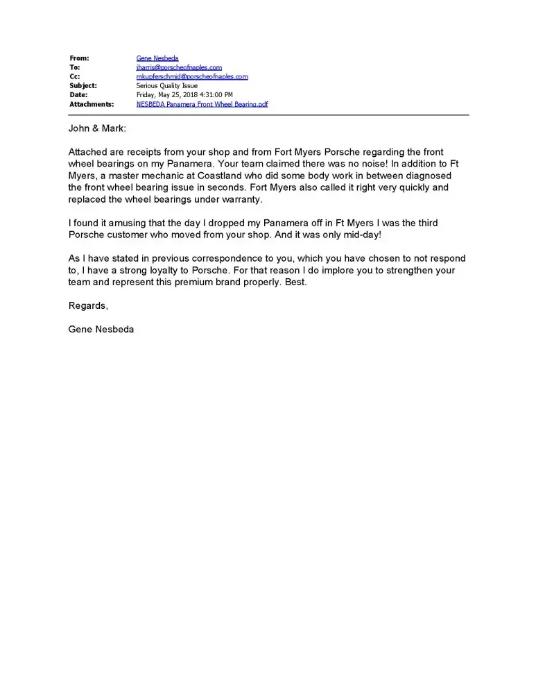 Naples Porsche either misdiagnosed or just lied about checking for a noise in the front end that turned out to be failed front wheel bearings. A master mechanic at a Porsche certified body shop identified it in seconds. And Fort Myers Porsche did the same and replaced the bearings which were still under the original warranty. My experience with Naples was even worse than this, email to the GM attached that was never replied to.