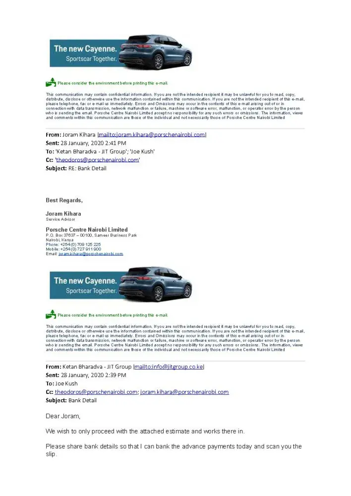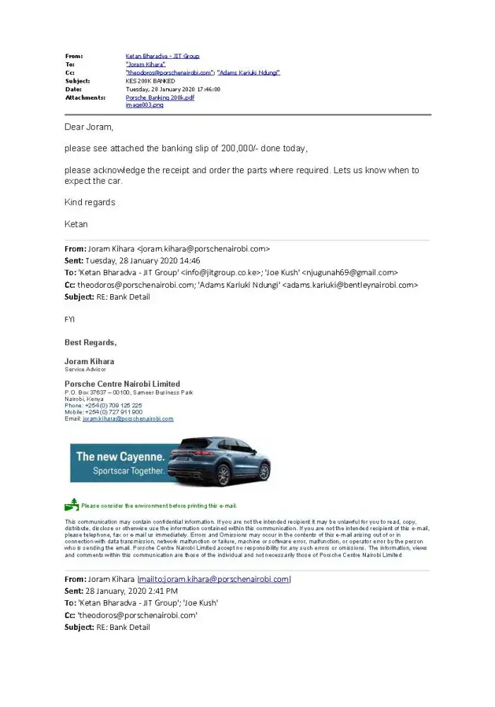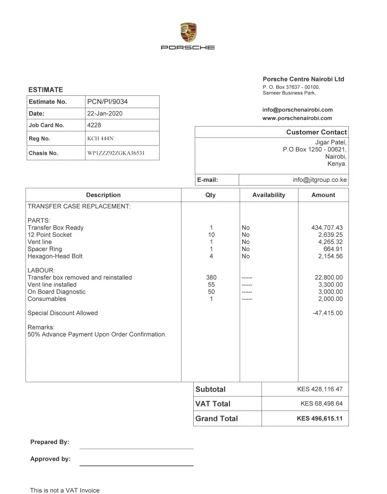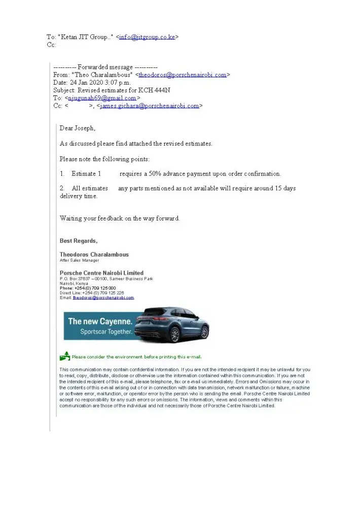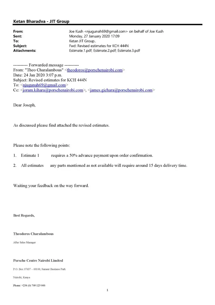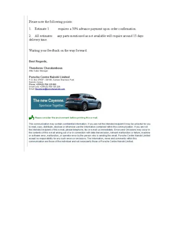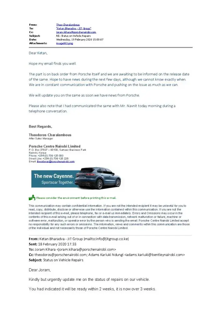 I have given my Porsche Cayenne Registration KCH 444N Chassis WP1ZZZ92ZGKA36531 For repairs Since 20th January 2020 to Porsche Center Nairobi on the 27/01/2020. I was issued a quotation which indicated that parts are to be imported and would take 2 weeks. I promptly made the payments in advance on 28/01/2020. After the payment was done, We have been chasing the service center for updates. We have always been given excuses that the Headquarters hasn't sent the parts on time or the parts are stuck somewhere in transit. This was way before CoVID 19 lockdowns began and affected flights. It is not fair for a customer to wait over 2 months for repairs to be done. I am highly disappointed with the Delays and shifting timelines.