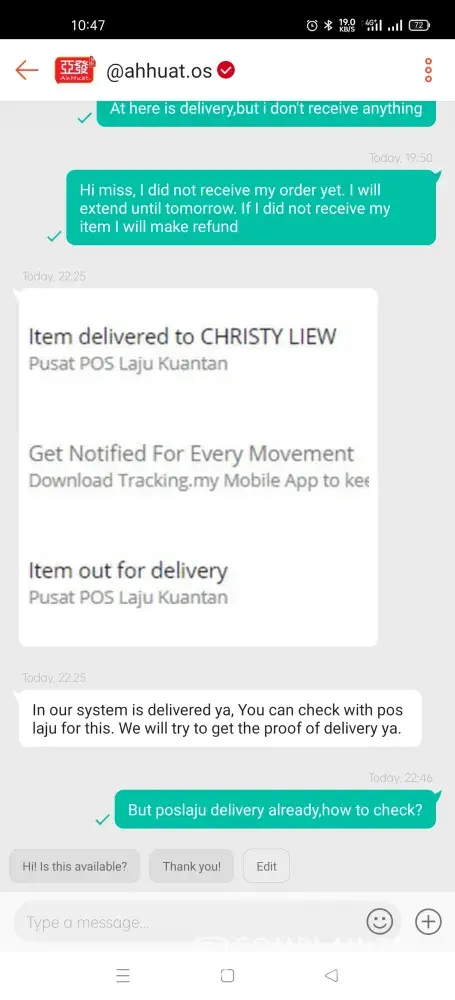 Hi poslaju, ni tracking no saya fr300346760my, alamat hantar ke kolombong kota kinabalu sabah, tapi kenapa delivery ke lahad datu? Dari 7 julai 2021 lagi saya buat complain sampai sekarang 29 julai 2021 belum dapat update dari pos laju. Tolong lah disebabkan korang, saya rugi rm 150, mgkin bagi korang rm150 tu sikit tapi bagi saya rm150 tu banyak. Boleh beli makan minum anak2.. Tolong lah buat kerja korang.. Dah la seller pun tak nak bertanggungjawab.. Korang pun diamkan diri.. Asyik bagi no ticket ja.. Tolong la.. Sya dah lah suri rumah, jual baju pun tak dapat sebab korang pnya kerja tak btl.. Boleh pula dri kota kinabalu hntr ke lahad datu.. Aduii.. Enta siapa yg trima pun tak tahu.. Tolong yer korang.. Tolong buat kerja bagus2, tak sure alamat di mana korang call la number yg kena bagi tu bukan main hantam ja hantar sesuka hati.. Harap ada tindakan la dri korang lepas ni.