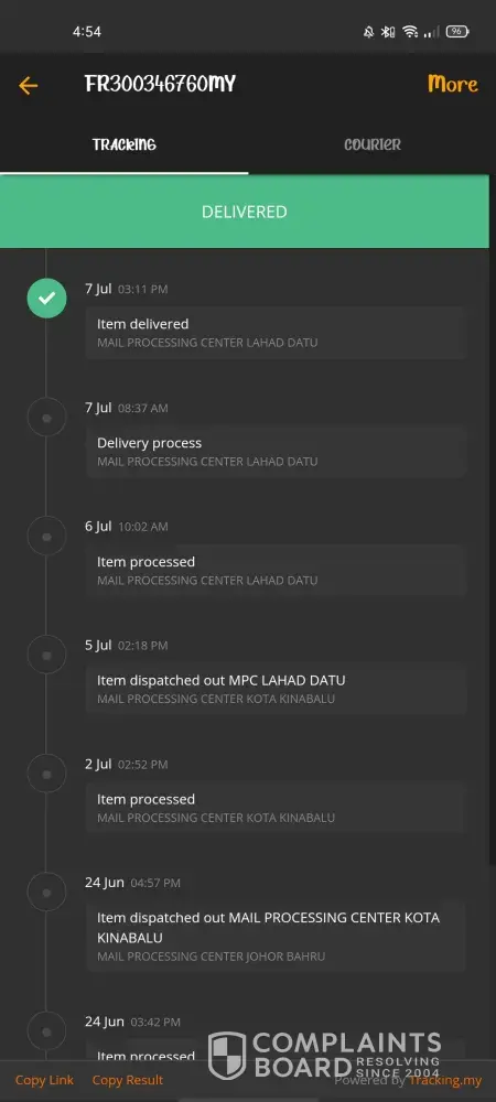 Hantar 2 barang pada hari yang sama. 1 sampai (ERC614080699MY) dan 1 tak sampai (ERC614066119MY)