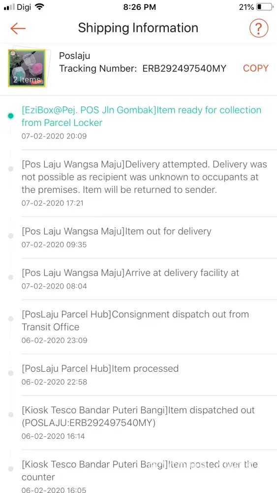 I Love to shop at popular e-commerce app known as [Shopee] and lately I bought few products from there at the same time. Everything was deliver on time. Of course some was delivered by J&T Express, DHL Express as well as Poslaju. Poslaju courier never fails me before. But today is my first encounter something was off. Its awful. Because it appears in system stated that Delivery was not possible as recipient was unknown to occupants at the premises. And item will be returned to sender. What a irresponsible person. The postman don't even contact me for further investigation. For information Seller from Shopee are unable to amend the address provided by Buyer as they can only allow print all the information and attached together with the parcel itself . Kindly Advice. I know is Friday but shouldn't be taking a task (JOB) lightly. Hope to Hearing from you soon.