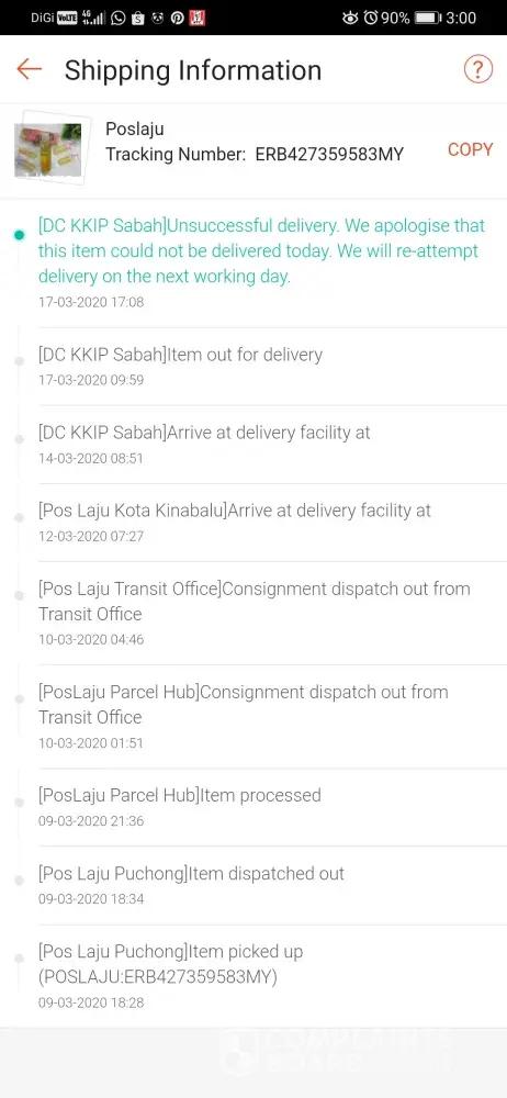 (I'm using friend address) item out of for delivery at 12.03.2020, 10.28 am.. I'm ask my friend about item if she received, She said not yet. I'm call pos laju office at 5.40 pm and ask if the postman returned to their office.. He said not yet. He gave me the postman number. I'm call the postman at 5.45 pm and ask if he hve delivered the item, he said he give to person at infront home. I'm telling him why you give to wrong address.. He says no one at home means the right address.. I'm trying to track down the item. He decided to give item named Hajijah. Hajijah home's is next to. My friend's daughter go to that home and ask if she received item from postman. She said not sure. My friend's daughter came back and returned with empty-handed.
