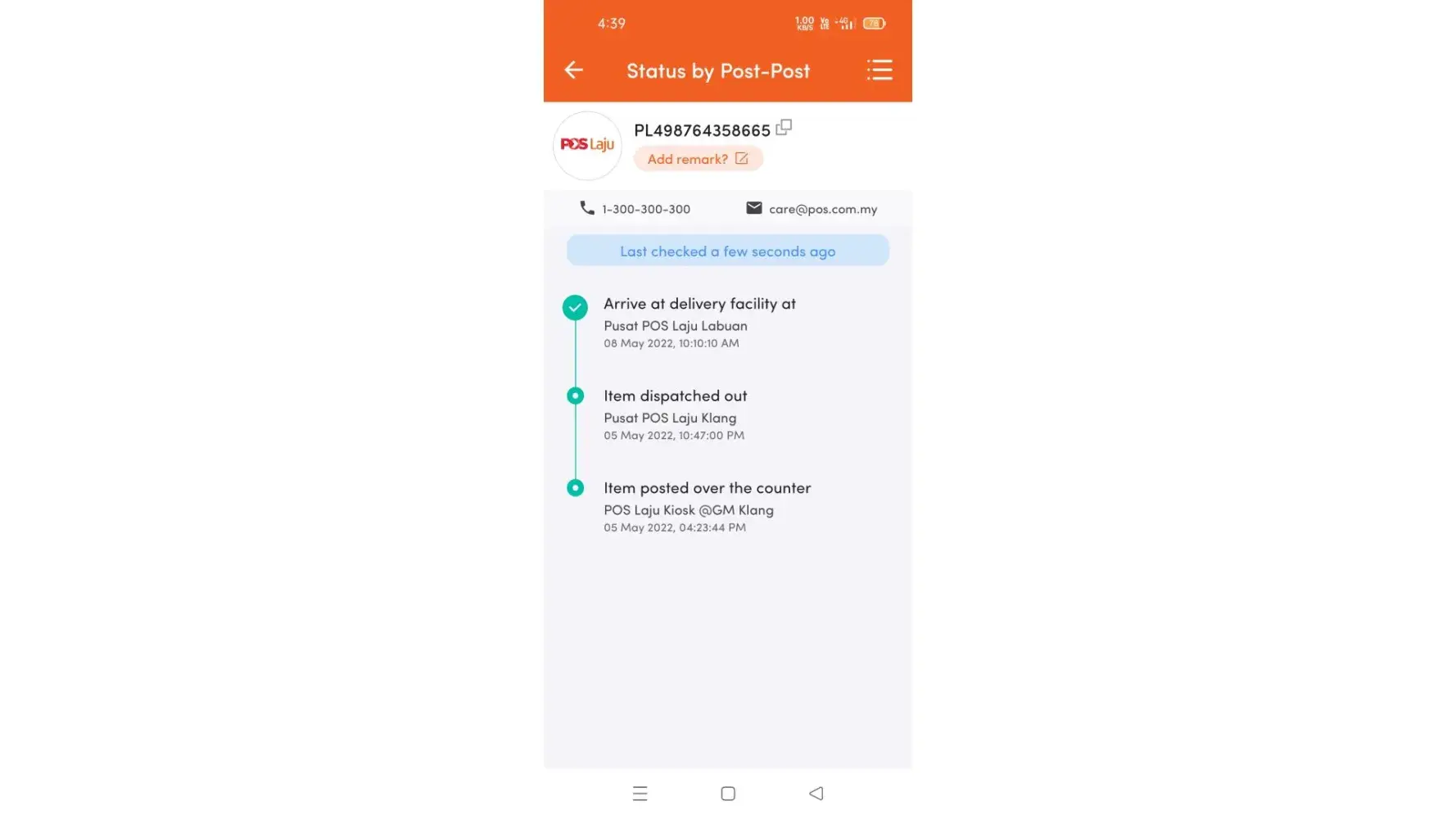 1. Poslaju Tracking system said item was delivered to Pusat Poslaju Balakong on 20 May 2022. This is not my home address, this is Poslaju office.