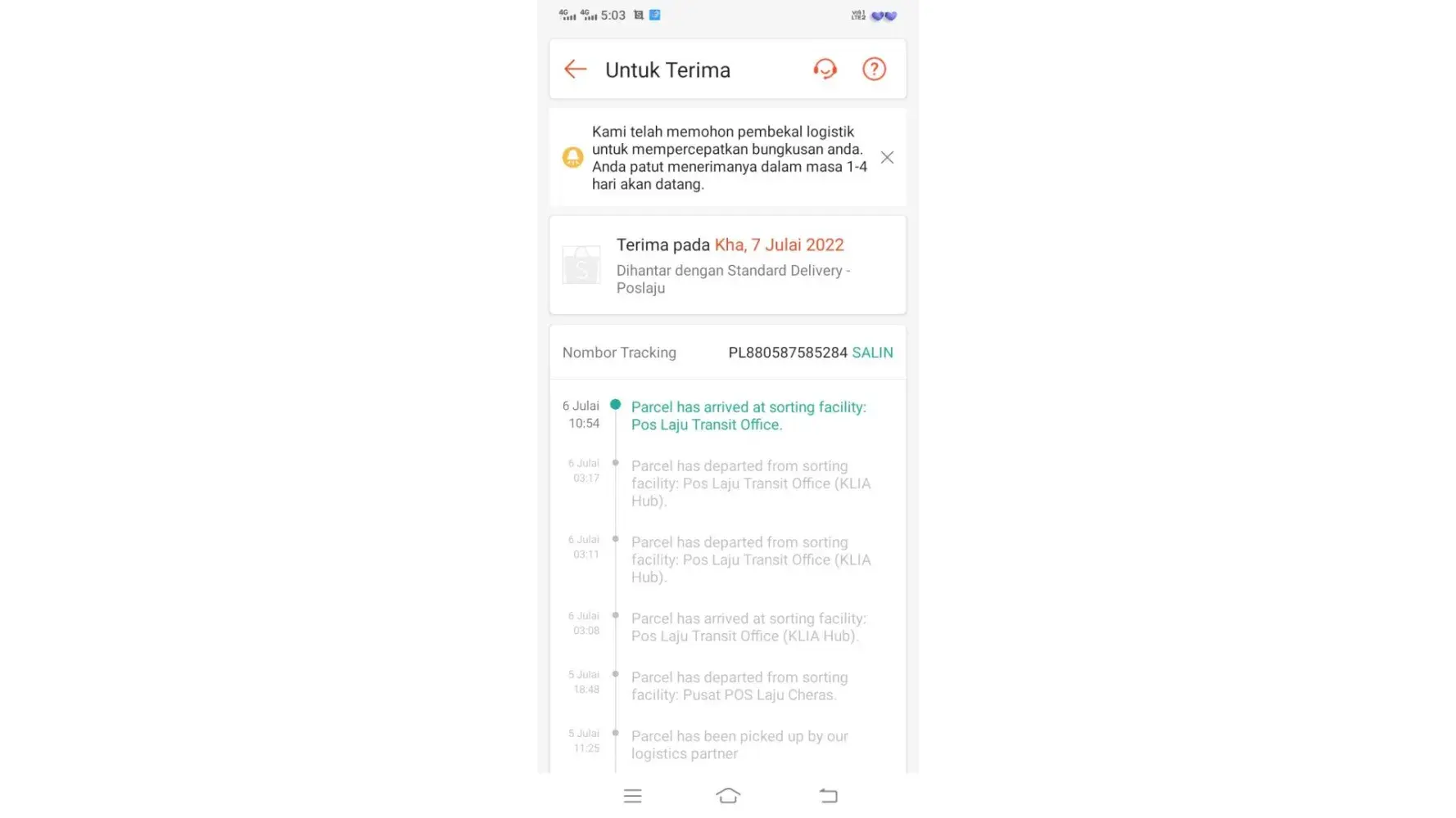 Barang poslaju saya PL880587585284 lambat dari tarikh yang sepatutnya