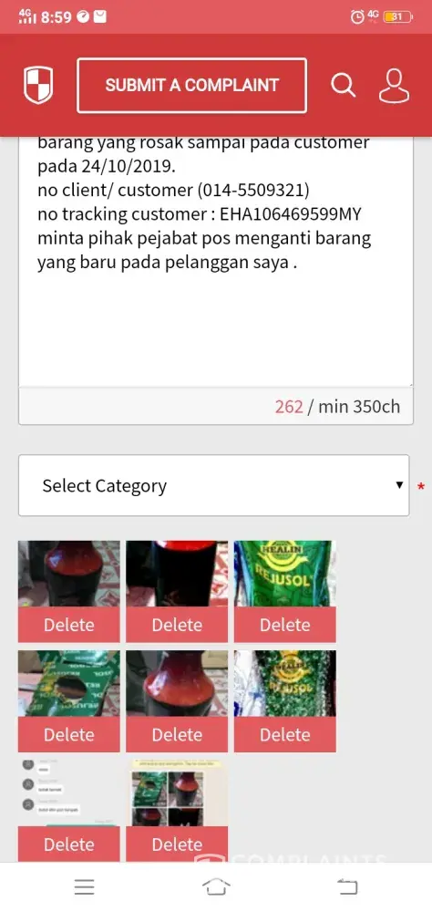 Barang dihantar pada customer pada 17/10/2019 dan sampai pada customer pada 24/10/2019, tetapi customer menerima barang dalam keadaan kotak yang kemek dan isi botol di dalamnya tertumpah sedangkan sudah dibalut dengan baik dan botol bukannya botol kaca botol plastik . saya ingin meminta pihak pos menggantikan barang yang baru pada customer saya sebab saya pos dalam keadaan yang baik minta segera amik tindakan . number customer [protected] dan no tracking client ( EHA106469599MY)