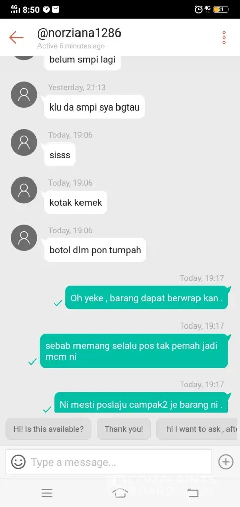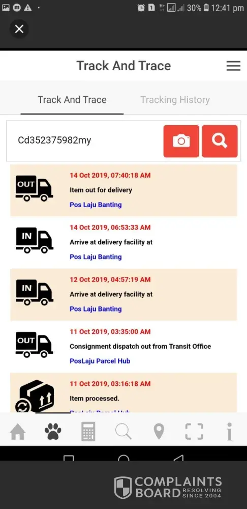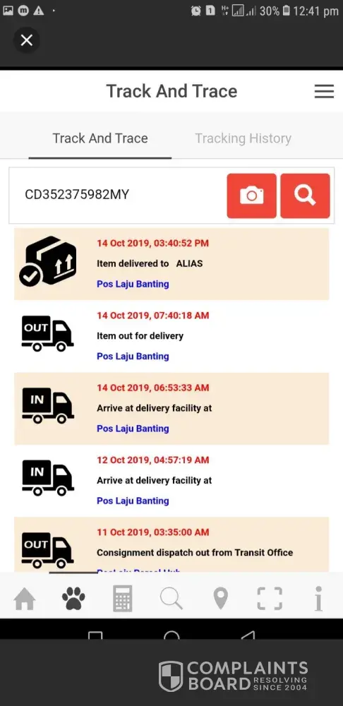 Saya nak buat aduan mengenai barang saya. Barang pelanggan saya telah dipos pada 21hb Oktober 2019. Tapi tidak sampai ke tangan saya sampai sekarang (28hb oktober 2019). Bila disemak no tracking dapat jawapan 'NOT FOUND'. HARAP DSELESAIKAN SECEPATNYA. DAN PARCEL SAYA SELAMAT DIBERIKAN KEPADA SAYA. SEBAB BARANG PELANGGAN HILANG TAKDE SIAPA NAK GANTI. THANKYOU.