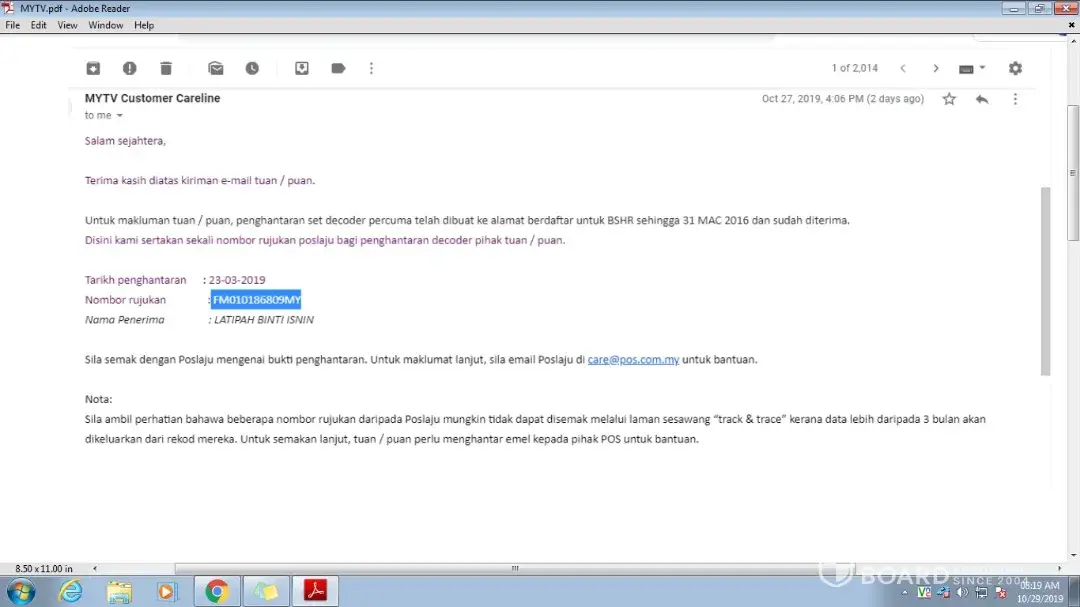 Dilampirkan nombor trecking Pos Laju yang diberikan oleh pihak MYTV: FM010186809MY