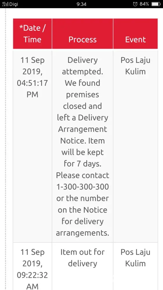 19 Sep 2019, 04:22:00 PM Delivery attempted. We found premises closed and left a Delivery Arrangement Notice. Item will be kept for 7 days. Please contact 1-300-300-300 or the number on the Notice for delivery arrangements. Caw. Serahan Seremban.