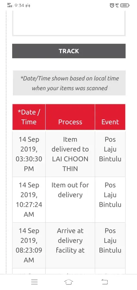 Barang pos laju ERA479968797MY sehingga hari ini belum saya terima. Last saya pergi ke pejabat poslaju pada 13/9/19 staff bagitau barang saya belum diproses..sedangkan item dah arrived di poslaju bintulu pada 11/9/19..bila saya try trace lagi dlm sistem tracking poslaju pada malam 14/9/19 saya terkejut kerana brg saya sudah diterima tetapi atas nama orang lain dan bukan penghuni alamat yang terdapat dalam barang yg dikirim tersebut. Jadi saya nak tahu ke mana dan dimana barang saya dihantar oleh posmen poslaju btu..try call poslaju tapi tak pernah dapat...sangat2 kecewa dengan perkhidmatan poslaju..