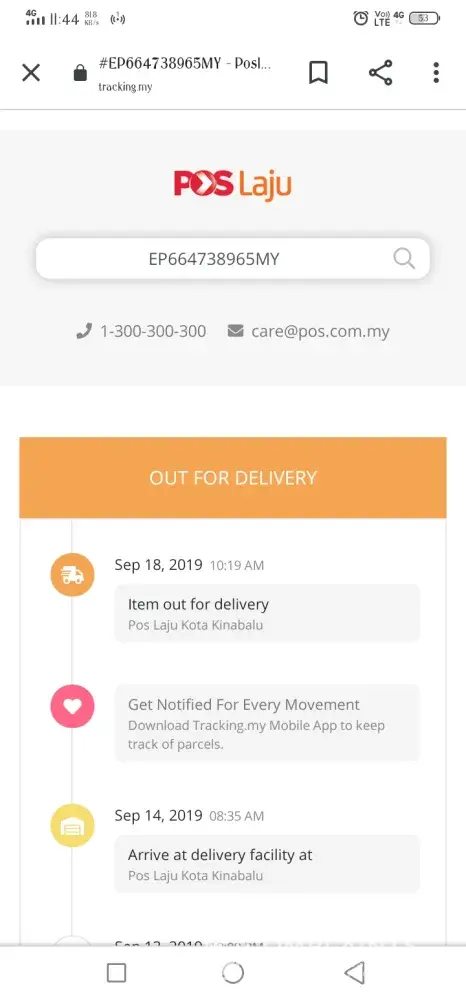 Saya ingin membuat aduan tentang parcel Saya yang sepatutnya diterima pada Hari ini. Status mengatakan barang telah dibawa keluar untuk tujuan delivery. Tapi sehingga ke lewat petang jam 5 pejabat Saya telah tutup. Masih juga belum sampai parcel Saya. Padahal pagi tadi kawan Saya sebagai wakil terus ke pejabat poslaju Kota kinabalu ingin mengambil sendiri parcel tersebut tapi tidak diendahkan oleh pekerja poslaju. Service apakah ini? Macam2 alasan mereka. Padahal kawan Saya telah membawa gambar ic Saya sebagai bukti boleh mengambil parcel. Alasan mereka parcel telah dibawa keluar. Tetapi tidak sampai2 kepada Saya. Ep664738965my