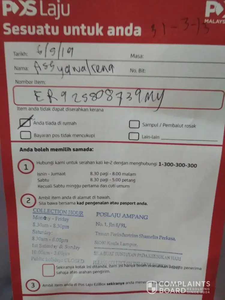 Hi, saya nk complain, , sudah beberapa kali staff poslaju tidak menghantar parcel ke rumah, tetapi sebalik nya hanya meninggalkan note di peti surat untuk ambil sendiri di pejabat pos. Saya boleh mengesahkan 100% bahawa rumah saya sentiasa ada orang. Saya membayar untuk caj penghantaran terus kerumah, tetapi kenapa pihak pos laju tidak melakukan tanggungjawab yang sepatutnya. Jika tidak boleh hanta terus kerumah bagi tahu awal2, supaya jurujual boleh menggunakan khidmat lain untuk penghantaran. Ini tracking pos er925808739my.