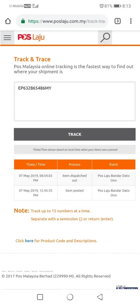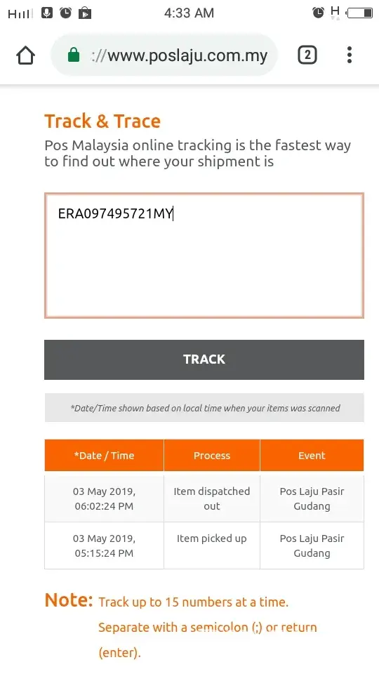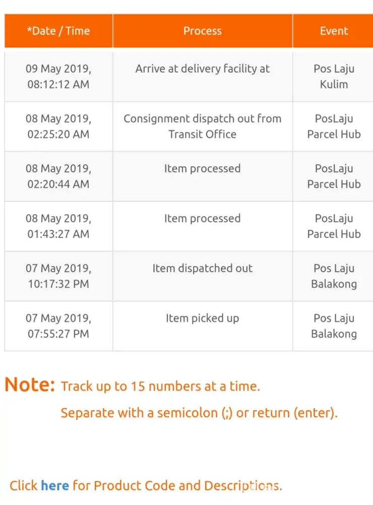 Saya mohon agar pihak POS LAJU AYER HITAM dapat hubungi semula mana2 penerima barang yang kelewatan dan sentiasa mengemaskini tracking no.