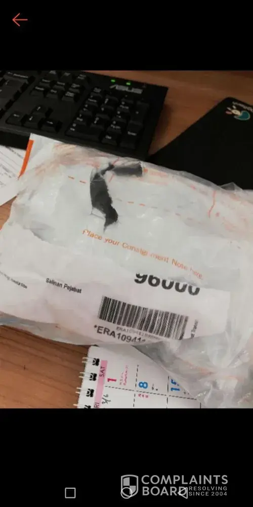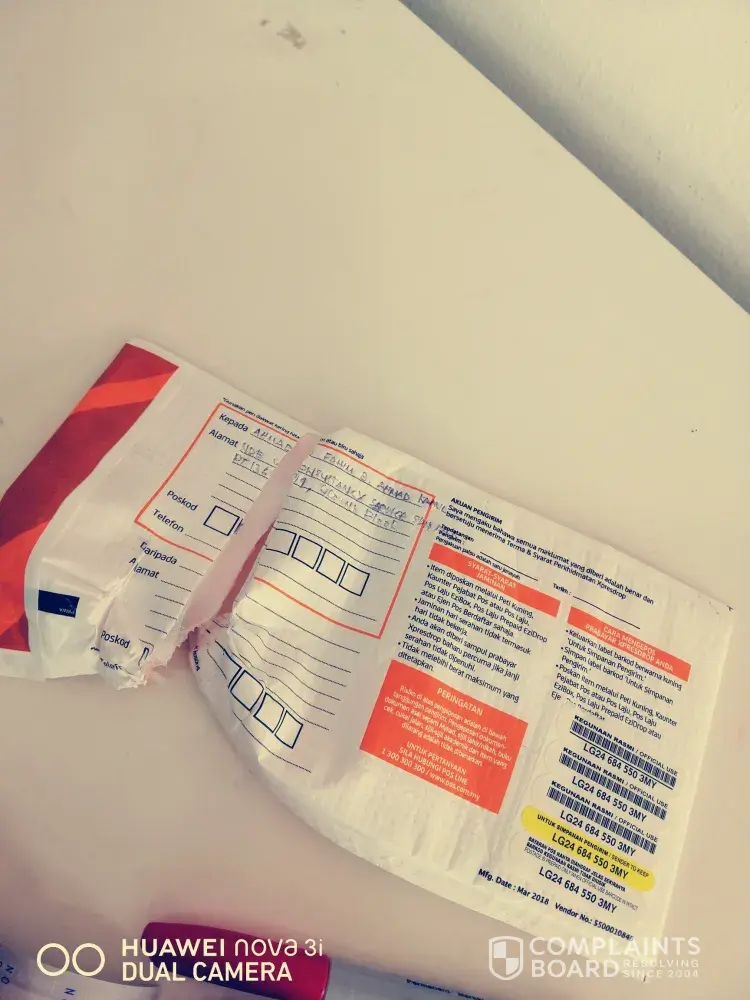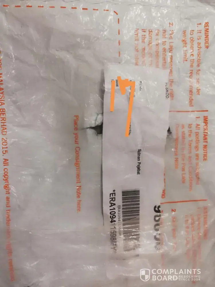 telah hilang (dicuri). Setelah memeriksa Flyer Poslaju yang digunakan, terdapat bekas koyakan, terlindung di belakang Consignment Note. Ini taktik yang licik untuk mengaburi mata penerima semasa serahan parcel. Tidak pasti sama ada posmen (yang menerima/ menghantar/ scan parcel) tahu yang flyer telah koyak dan item telah dicuri. Tetapi Bar code & QR Code & alamat penghantaran tertulis pada consignment note dan koyakan adalah di belakang consignment Note. Sungguh mengecewakan lagi, parcel yang telah koyak tidak patut diproses sehingga ia diserahkan kepada penerima tanpa diberitahu keadaan parcel terlebih dahulu.