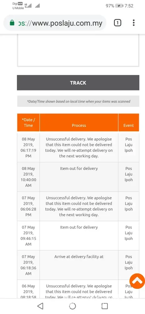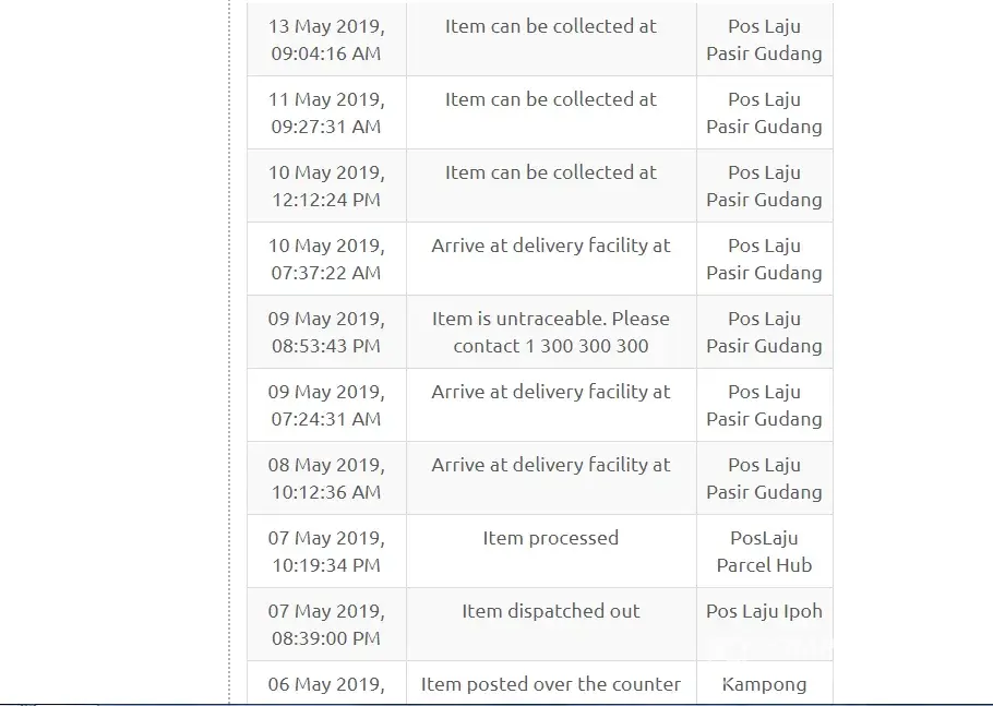 What a great service from poslaju where nobody intended to deliver my consignment to door step after item dispatched out from Pos Laju Bayan Lepas on 25-April-2019 . No call and no delivery arrangement notice given. What kind of service pay service for when you need to hassle and call up bank for tracking number and collect your contingent yourself?