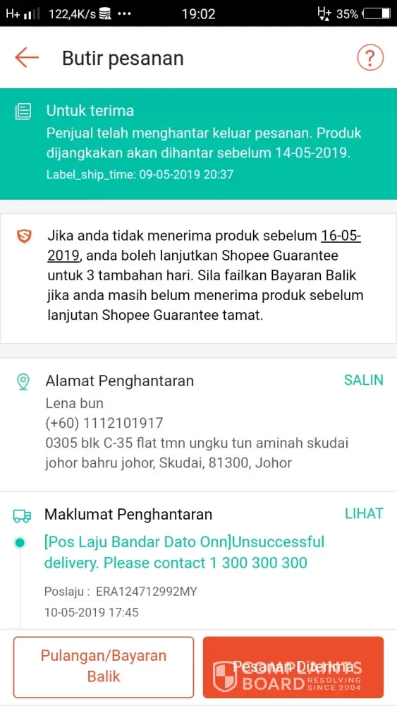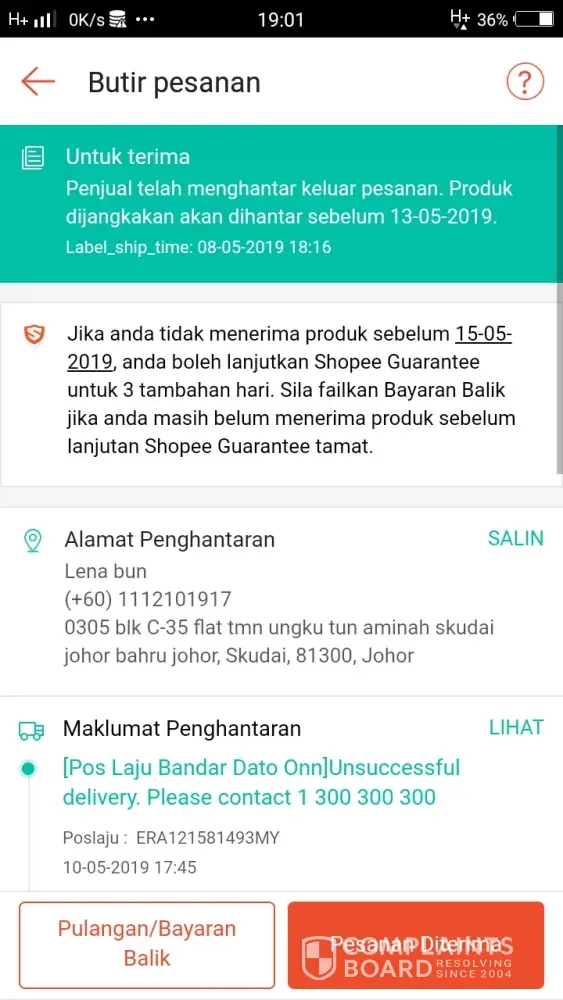 Barang pesanan dari POS LAJU KLANG masih belum diterima sehingga sekarang 11/5/2019 sedangkan kemaskini akhir tracking no adalah pada 3/5/2019.