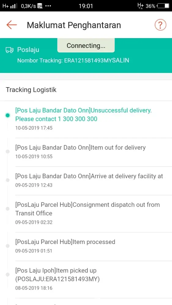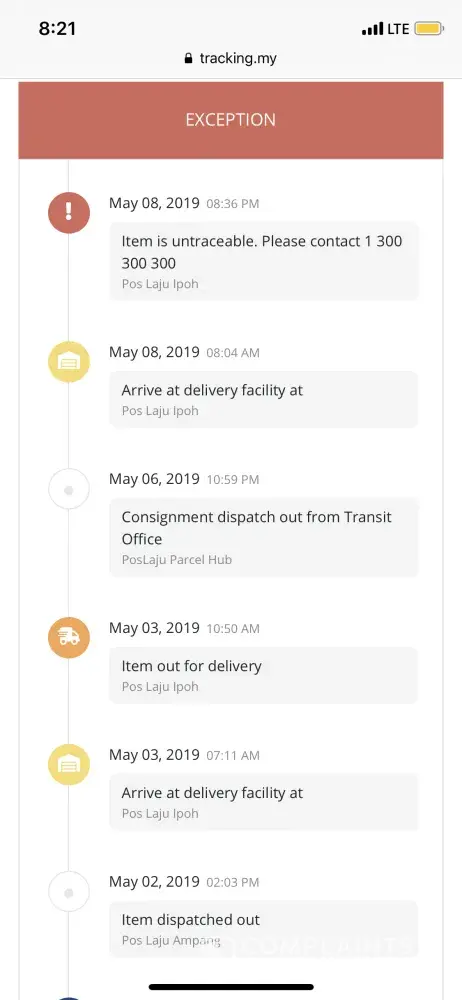 Pos Laju Ipoh cakap drive sudah angkat barang keluar, tapi tak tau saya barang sudah pergi mana.. 3 May 2019 sudah sampai pos laju ipoh,sekarang 13 May 2019 pun belum tolong settle.. panggil saya report HQ.. saya 6 May 2019 4.20pm sudah report HQ.. report number [protected].. tapi sampai hari ini 13 May 2019 belum settle again.. sangat sangat sangat bad service..